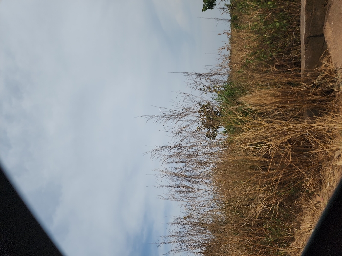 The scene captures an outdoor environment in Akwanga, Nigeria. The lower two-thirds of the frame are filled with dense, predominantly desiccated brown grasses and brush, punctuated by areas of green vegetation and several small trees. A dirt path or shoulder runs along the base of the foliage, featuring a grey concrete curb in the lower right. The upper third displays a pale blue sky with diffused cloud cover. A dark, irregular object occupies the top-left quadrant, partially obstructing the view. No individuals, animals, or man-made structures beyond the curb are observable, and no actions or interactions are depicted.