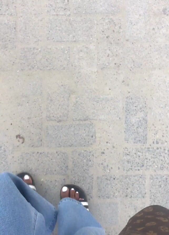 person walking on a gray, brick-paved surface. The person is wearing light blue jeans and black and white striped Adidas-style sandals with white nail polish on their toes. A brown handbag with a repeating pattern is visible next to the person's leg. The person is walking at a regular pace, and the camera is focused on their feet and lower body. The lighting is bright, suggesting an outdoor setting. A piece of debris, possibly a small twig, is briefly visible on the pavement.