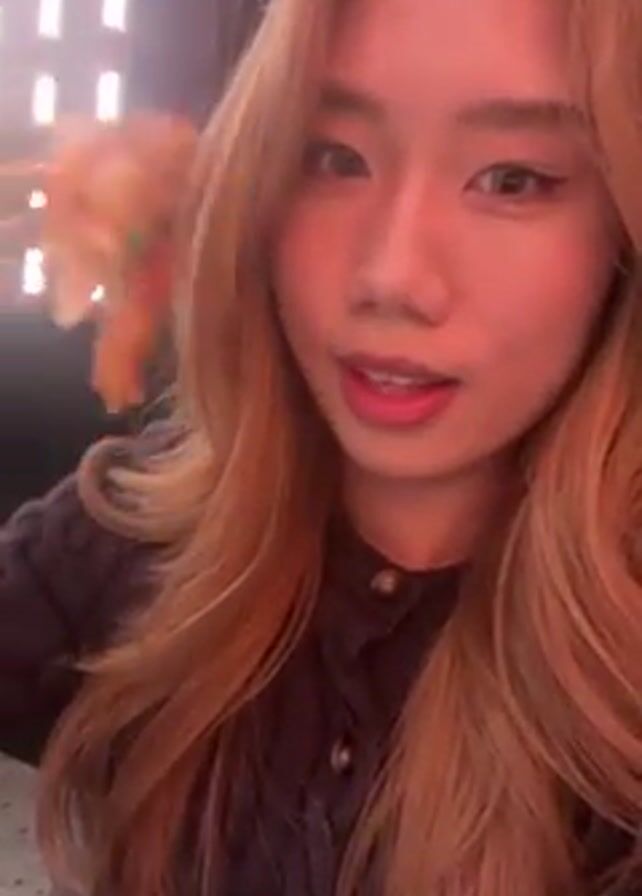 A young woman with blonde hair is holding up a piece of fried food, possibly shrimp, with chopsticks. She opens her mouth and appears to be eating the food, then smiles and looks at the camera. The background includes a lighted wall fixture and what looks like the interior of a restaurant. She is wearing a dark button-up shirt or sweater. The lighting in the room appears warm or reddish.