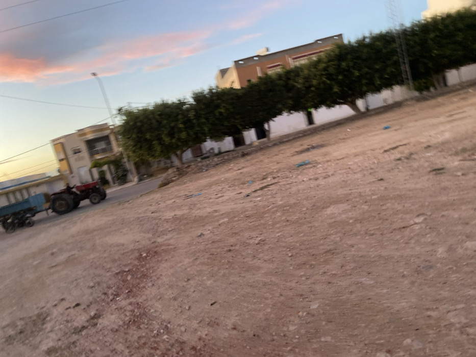 A rural scene unfolds at dusk, with a tractor towing a trailer on a dirt road. Buildings line the background, partially obscured by trees. The sky transitions from yellow on the left to a pink-tinged blue above. The landscape appears barren and dusty, hinting at an arid climate.