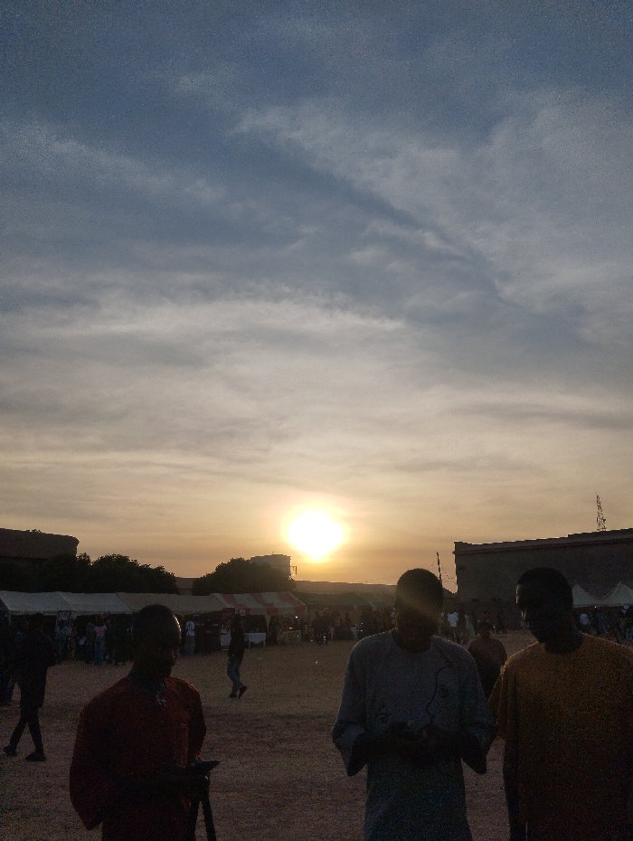 The image depicts an outdoor gathering at sunset in Sabon Tasha, Nigeria. The sky occupies the upper two-thirds, transitioning from a dark blue overhead to a lighter blue and warm orange-yellow closer to the horizon. Scattered stratocumulus clouds are present. The sun, a bright, intense orb, is positioned slightly right of the vertical center, low on the horizon, casting a strong golden light. In the immediate foreground, three male individuals are partially silhouetted. On the left, a male in a reddish garment holds a small device and stands next to a dark tripod. In the center, a male wearing a light gray garment looks down at an object held in his hands, with sunlight reflecting off his upper body. To the right, another male in a yellow t-shirt stands, facing left towards the central figure. The midground features a flat, open expanse of dry, light-colored ground. Numerous individuals are visible in the distance, indicating a crowd. Several white tent-like structures, consistent with stalls or temporary shelters, are arranged horizontally across the scene. Dark foliage from trees is visible behind these structures on the left. In the background, solid, dark-colored buildings are discernible on both the left and right sides. The horizon line beneath the sun appears largely flat, with distant topographical features or structures. A tall, slender structure, possibly a mast or tower, is visible on the far right.