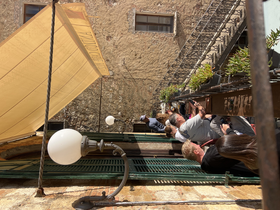 This image depicts a sunlit outdoor café balcony situated within a narrow street in Montepulciano, Italy. The scene is viewed from an elevated perspective. To the left, an aged brick and stone building features closed green louvered shutters on its windows. An ornate black metal street lamp with a large white spherical globe is mounted prominently on this wall, connected by a twisted metal bar extending across the frame. Above the balcony, a large, rectangular yellow fabric awning is extended, displaying the inverted partial text "ANTICO CAFFE BO...". On the balcony itself, a group of six individuals is present. Five are seated at a dark, narrow counter-like table. From left to right: a person with blond hair in a black long-sleeved shirt, a woman with long dark hair, a man in a grey t-shirt with a blue graphic, and a partially obscured woman, all actively looking at or interacting with their smartphones. Further back, a woman with curly brown hair is also seated. A sixth individual, a man wearing a blue shirt and a grey baseball cap, stands near the rear of the balcony, facing the seated patrons, appearing to be attending to them. Several smartphones and a pair of sunglasses are visible on the counter surface. The balcony is bordered by a dark, ornate wrought-iron railing adorned with multiple black rectangular pots containing green succulent plants. To the right of the balcony, a weathered light-brown stone wall features a small rectangular window with a dark frame and a smaller, distant white spherical street lamp. A steep, decorative wrought-iron staircase ascends alongside this textured wall. The entire scene is brightly illuminated by direct sunlight, creating distinct shadows.