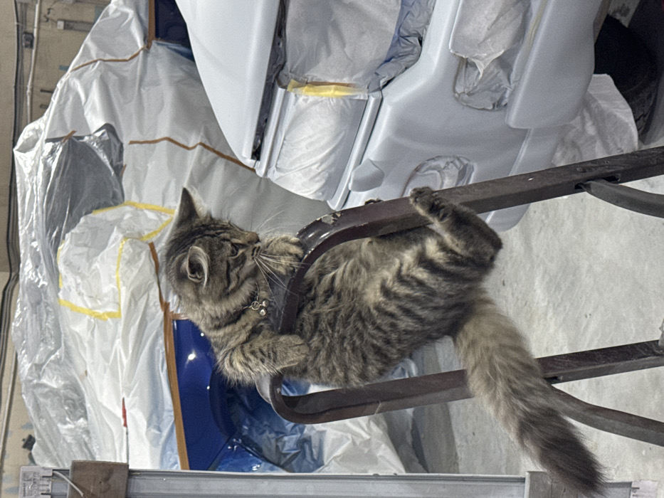 In Myaglovo, Russia, a long-haired tabby cat with brown and black stripes and a collar featuring two small bells is observed precariously perched on the top rung of a dark-colored metal step ladder. The cat's front paws grip the top rung, with its body extended downward and its head tilted, looking towards its left paw. Its fluffy, striped tail hangs below. In the background, to the right of the cat, the front section of a light grey or white vehicle, possibly a car or truck, is visible; it is undergoing preparation, indicated by masking tape around the headlight areas and a primer-like finish. Behind the cat and vehicle, various items and structures are covered with large sheets of white and clear protective plastic, secured with yellow masking tape, consistent with an automotive repair or paint shop environment. A blue object is partially visible behind the sheeting on the left. The floor appears to be concrete.