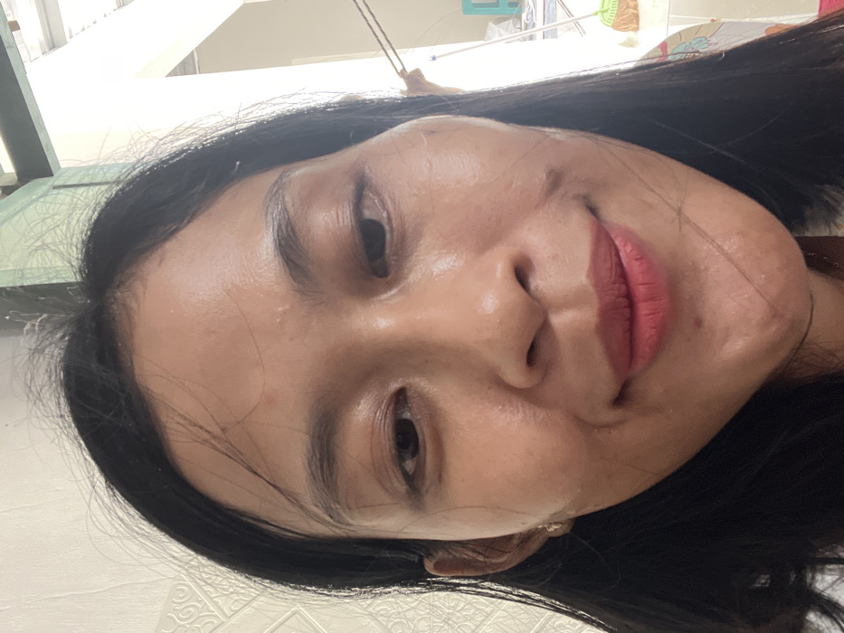 A woman's face fills the frame, angled slightly. She has smooth, fair skin, dark eyes, and dark hair that frames her face. Her lips are colored a light red-pink. The background is indistinct, showing a glimpse of a window and ceiling. The overall lighting is bright. Her expression is subtly smiling.