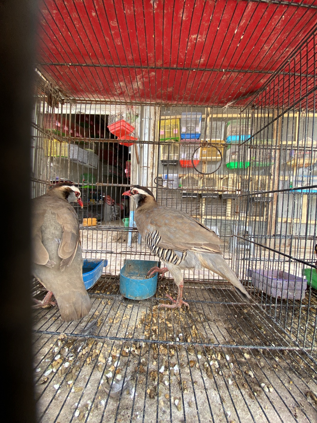 The image displays two Chukar partridges (Alectoris chukar) confined within a large, rectangular wire cage, located in an outdoor market setting in Kandahar, Afghanistan. A red corrugated metal awning is positioned above the cage. Both birds exhibit grey-brown plumage, distinctive black and white striped flanks, and a black band extending from the forehead through the eyes. They stand on the wire mesh floor of the cage, which is soiled with numerous bird droppings and debris. Two blue plastic feeder or water dishes are placed on the cage floor. In the background, numerous smaller, multi-colored wire cages (green, blue, yellow) are visible, some appearing to contain additional birds, indicating a bird selling area within the market. No human figures are present.