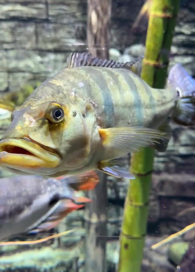 close-up view of a fish in an aquarium. The fish has a light brown body with dark stripes, a yellow mouth, and an eye with a dark pupil. It is swimming near green bamboo-like plants. Other fish are visible in the background, some with orange fins. The aquarium has a background that resembles a stone wall. The camera is steady and focused on the fish.