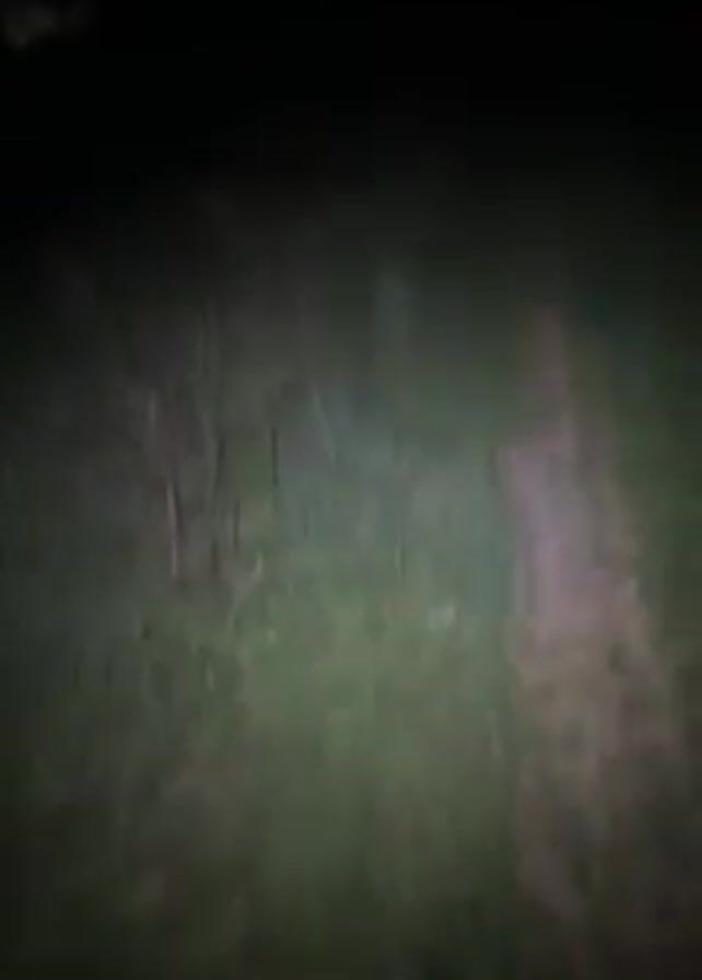 At night, a person is shown walking across a grassy field towards the camera. The person is wearing dark clothing and black boots. They appear to be holding some sort of device. In the distance, lights can be seen.