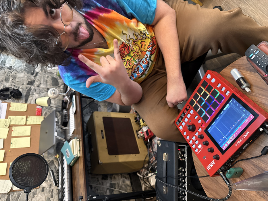 A male subject with medium-length dark curly hair, a beard, and wearing tinted round glasses, a tie-dye t-shirt, and brown pants, is seated facing forward. His tongue is extended from his mouth, and his left hand is raised, forming a "rock and roll" gesture. The scene is an indoor music production or recording space. In the immediate foreground, on a wooden table, a red Akai MPC One+ music production sampler/sequencer is displayed, connected by a braided cable. Adjacent to it are a small green object, a clear glass object, a small silver cylindrical object, and a black remote control resting on a brown leather surface. Behind the subject, a wooden desk holds a black pop filter on a stand, a black MIDI keyboard, a silver laptop on a stand, a white computer keyboard, a stack of blue notebooks, various audio equipment, a desk lamp, and a pair of black headphones. Under the desk, a tan Fender amplifier and a black amplifier head are visible, alongside multiple colorful guitar pedals and cables on the floor. The background features a corkboard covered extensively with yellow sticky notes, set against a wall with a gray, stone-like texture. The specific location within the city of Boston, United States of America, is not discernible from the provided image.