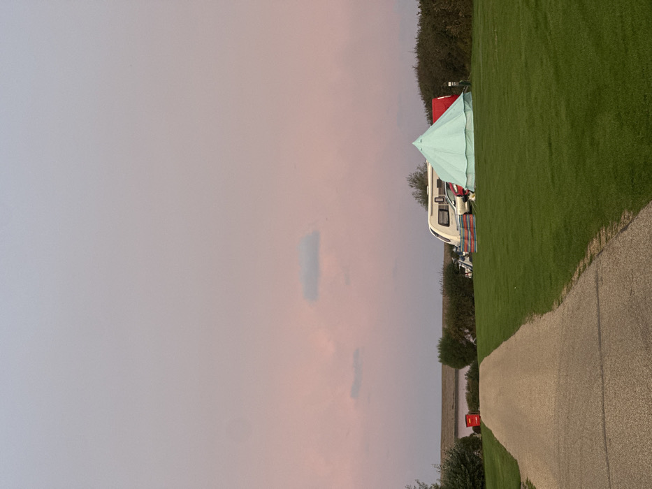 The scene depicts a caravan and camping site located near a body of water in Weymouth, United Kingdom, likely at dusk or dawn due to the ambient light. The sky, occupying the upper two-thirds of the image, displays a gradient from muted pink at the bottom to pale blue-grey at the top, with a few scattered, indistinct clouds. In the foreground, a paved asphalt path curves from the bottom center towards the left mid-ground. To the left of this path, in the mid-ground, a red Royal Mail pillar box is visible. The majority of the ground in the mid-ground is covered in neatly trimmed green grass. On the right side of the mid-ground, a white caravan with windows is parked on the grass. Adjacent to the caravan, a red car is partially visible. To the right of the caravan and slightly forward, a light blue, conical bell tent is erected. Behind the bell tent, a red windbreak or smaller tent structure is present. Various pieces of camping equipment, including a striped mat, are discernible around the caravan and tent setup. A low, earthen embankment stretches across the background, separating the grassy camping area from a calm body of water, which reflects the subdued light. Beyond the water, the horizon is indistinct. The camping area is bordered by various bushes and low shrubbery, particularly along the embankment and around the right side of the scene. No individuals are visible, and no active interactions or movements are depicted. The overall scene is static and tranquil.