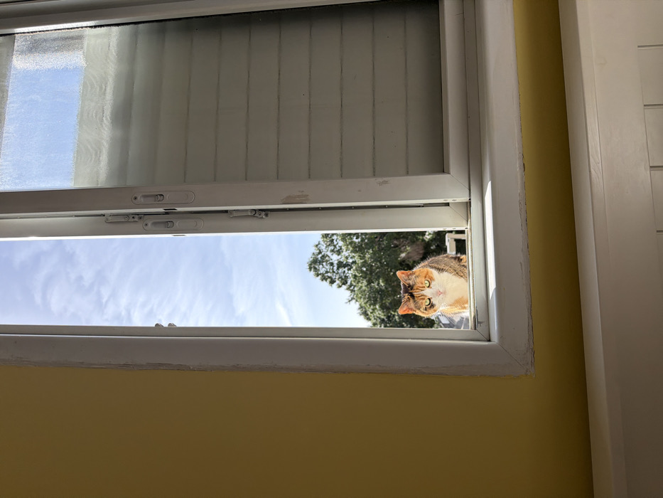 The scene depicts an interior perspective looking through an open window in Tel Aviv-Yafo, Israel. A calico cat with distinct orange, white, and dark brown fur patterns is positioned on an exterior ledge, visible through the open left section of the white-framed window. The cat faces forward, directly towards the viewer, with green-yellow eyes. The left window pane is open, revealing a clear blue sky with sparse white clouds, and the upper foliage of a green tree in the background. The right side of the window frame shows a closed white exterior shutter composed of horizontal slats, and multiple white interior window latches are visible on the frame. The interior wall around the window is painted a solid yellow. A white windowsill or molding extends horizontally across the lower portion of the image beneath the window frame. The overall environment is brightly illuminated by natural daylight.