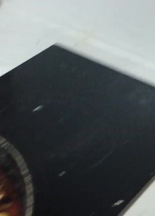 The video starts with a close-up of a pan filled with ramen noodles and what appears to be braised pork belly in a reddish sauce. A fork rests on the edge of the pan. The camera then moves, showing a white countertop beside the pan. It then goes to a darker surface, followed by a view of black marble-like floor tiles with white veins. A rolled-up pink item is visible near the edge of the frame on the right side. The video ends with a blurry shot of what seems to be a brightly lit area.