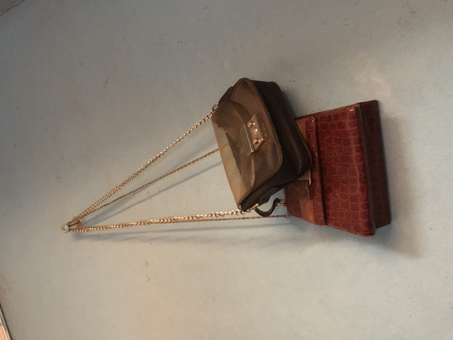 This image depicts two handbags hanging from a single, small, light-colored hook or nail embedded in a light blue-grey wall in Sabon Gari Nassarawa, Nigeria. The top handbag is a small, dark-colored (possibly black or dark brown) cross-body bag with a gold-colored chain strap. Its flap appears lighter in color, possibly beige or a faded/worn material, and features a prominent rectangular gold-colored clasp. Beneath and slightly behind the top bag hangs a smaller, structured handbag or clutch. This bag is reddish-brown with a distinct embossed texture, resembling crocodile or alligator skin. It also features a small, rectangular gold-colored accent on its flap. Both bags are suspended against the plain wall, casting a subtle shadow to their right and beneath them. No people are visible. The environment appears to be an indoor setting with uniform lighting.