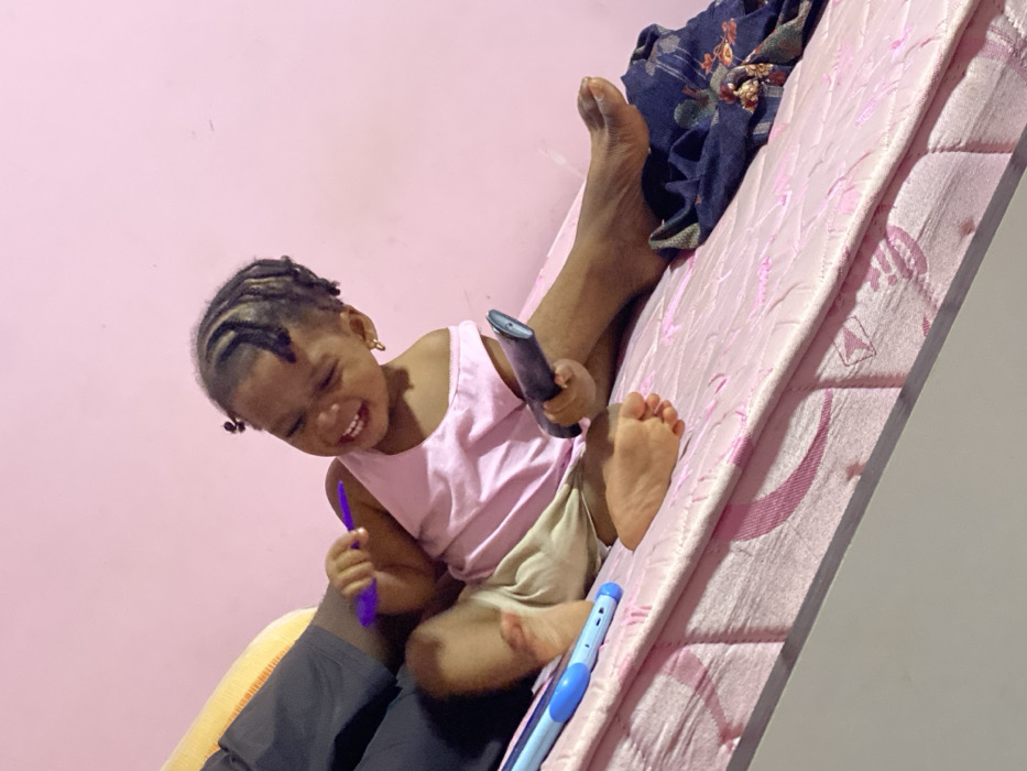 A young child with braids is sitting, held by someone whose legs are visible, on a pink mattress