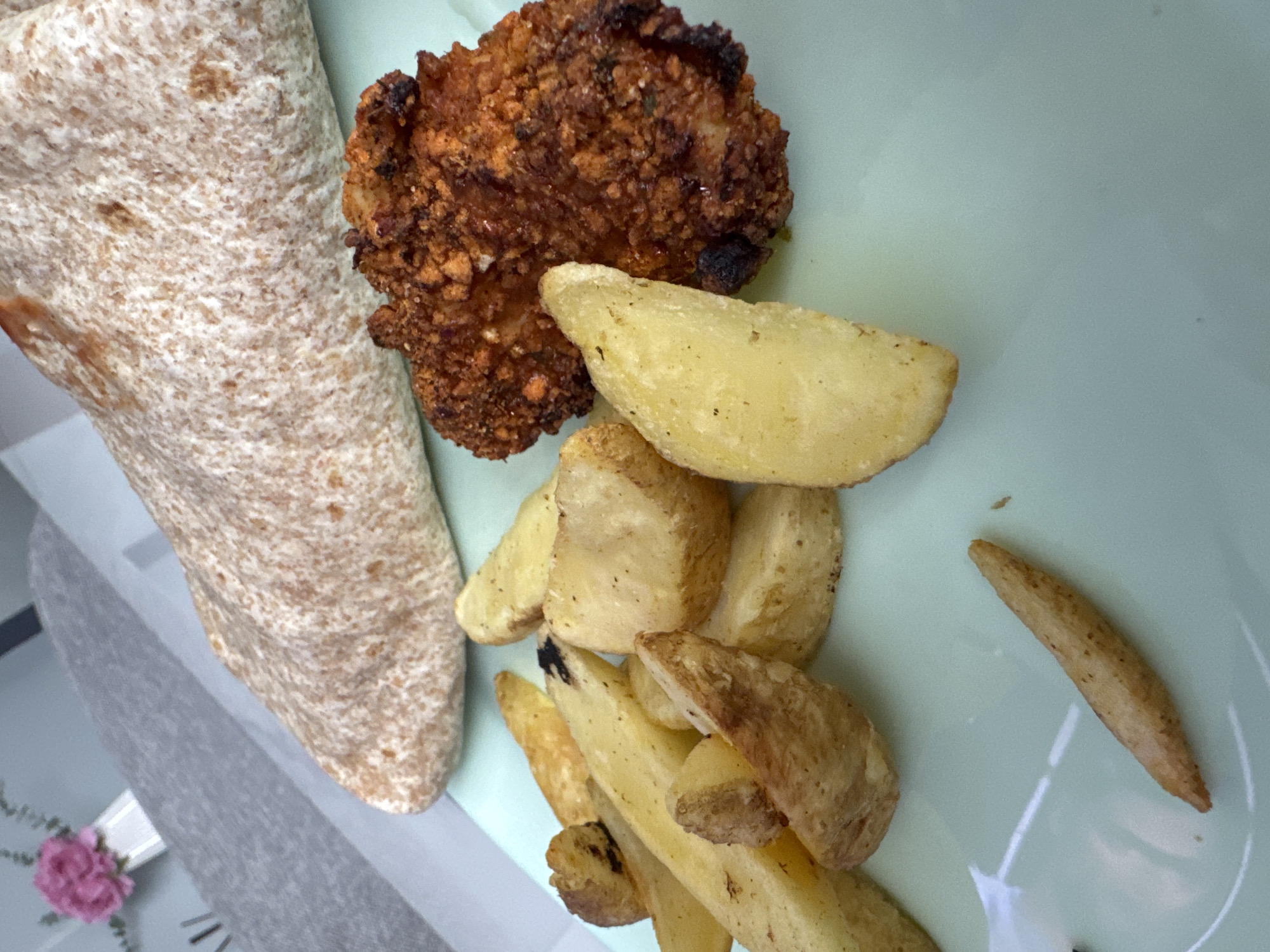 An overhead, slightly angled shot captures a meal presented on a light blue-green plate within an indoor dining environment in Zhiten, Bulgaria. No people are visible. The plate holds a large, elongated, light-brown tortilla or flatbread with a speckled texture, positioned towards the upper left. To its right and slightly below is a piece of dark reddish-brown, heavily breaded and fried chicken. Scattered across the left and center of the plate are numerous golden-brown potato wedges, varying in size and shape, with one slender, fry-like potato piece at the bottom center. The background is out of focus, revealing a light grey fabric surface, likely a tablecloth or placemat, and further back, a white vase containing pink flowers and green foliage. A faint vertical dark line is discernible in the far upper left background. The scene is brightly lit.