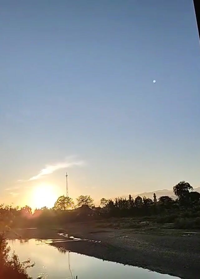 serene landscape at sunset or sunrise. A calm river flows in the foreground, reflecting the golden light of the setting sun. The horizon is marked by trees and the silhouette of a mosque's dome. A tall communications tower stands among the trees. The sky is a gradient of blue, transitioning to a warmer hue near the sun. A single, bright celestial object, possibly the moon or a planet, is visible in the upper right of the sky. The camera is static, offering a steady view of the scene.