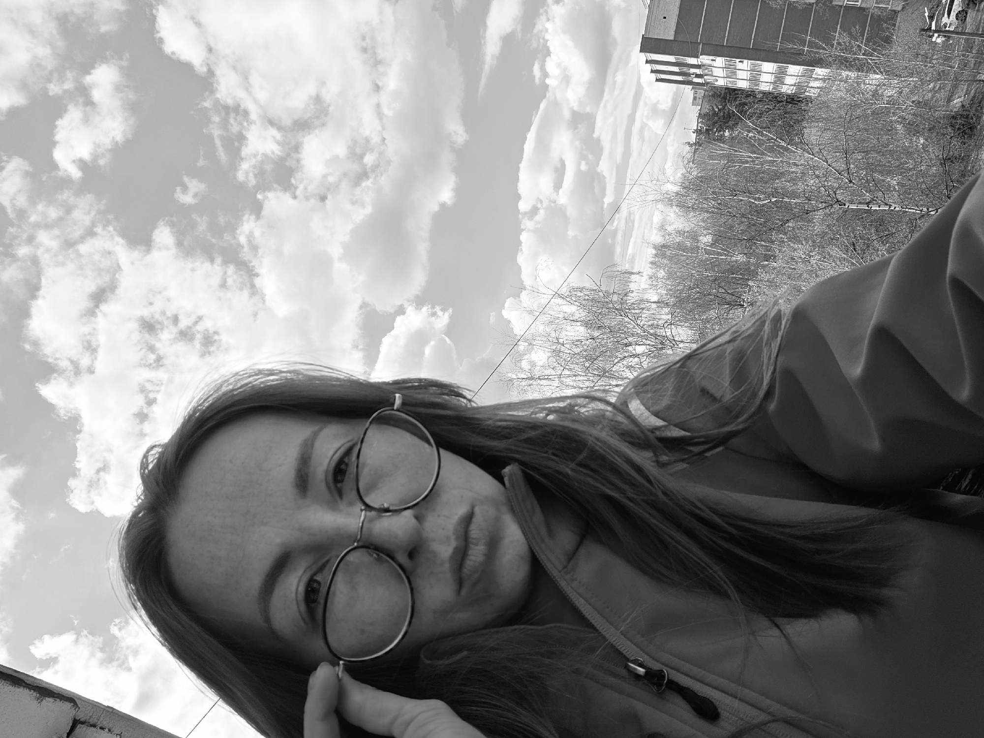 A monochrome, slightly angled shot captures a woman in the foreground with a cityscape and cloudy sky as a backdrop, potentially in Chaikovsky, Russia. The woman has long, straight hair and is wearing round-framed glasses. Her left hand is near her face, touching the glasses. She appears to be wearing a jacket. Her gaze is directed towards the camera. Behind her, a multi-story building with a repetitive window pattern is visible. Bare trees, common in colder months, are scattered around the building. A cloudy sky dominates the upper portion of the image, offering a contrasting brightness to the darker elements. The angle and composition suggest the photo may have been taken from an elevated position, possibly a rooftop or high balcony.
