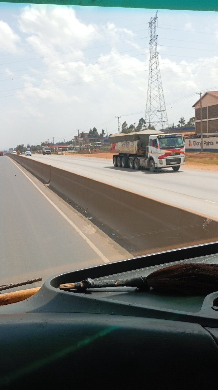 The image captures a daylight scene on a multi-lane highway in Limuru Central ward, Kenya, viewed from within a vehicle looking through the windshield