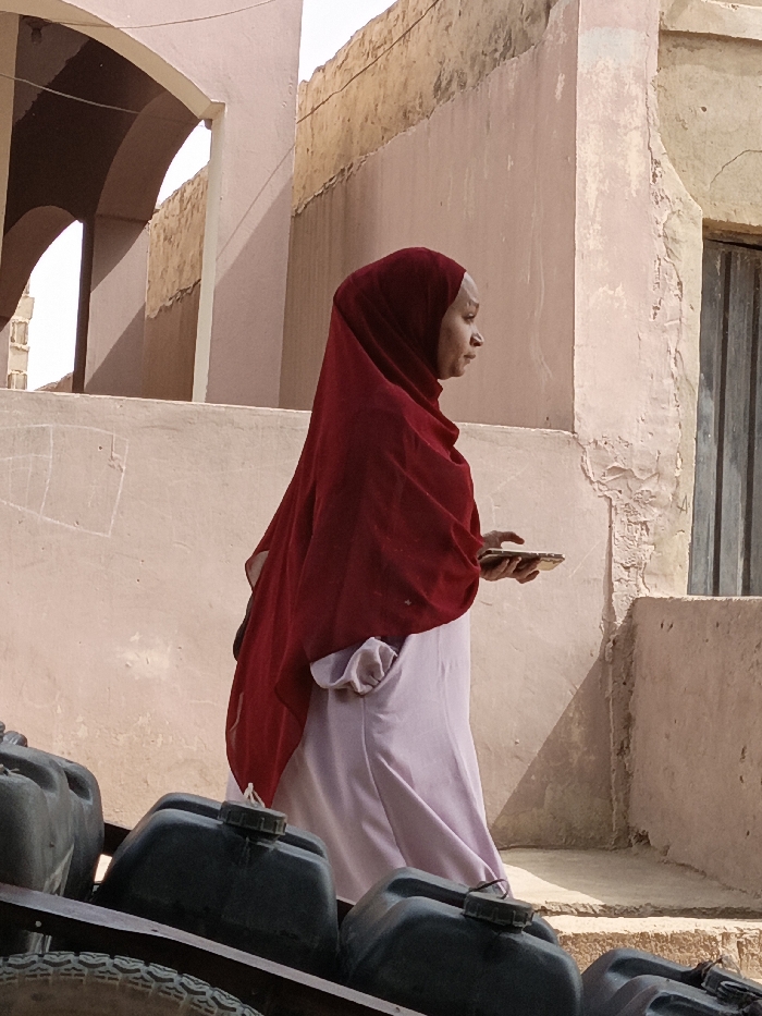 An outdoor, eye-level medium shot in Zango, Nigeria, depicts a woman in profile, facing right. She wears a dark red head covering and a light pink full-length garment. Her right hand holds a small, light-colored rectangular object. The background features aged, light pink-beige plaster walls exhibiting peeling paint and cracks. An arched opening with visible shadows is on the left, while a dark, vertically-oriented door or shutter is partially visible on the right. The scene is under bright daylight, indicated by strong shadows. In the lower left foreground, multiple dark grey plastic jerrycans are visible on what appears to be a cart, with a tire partially seen.