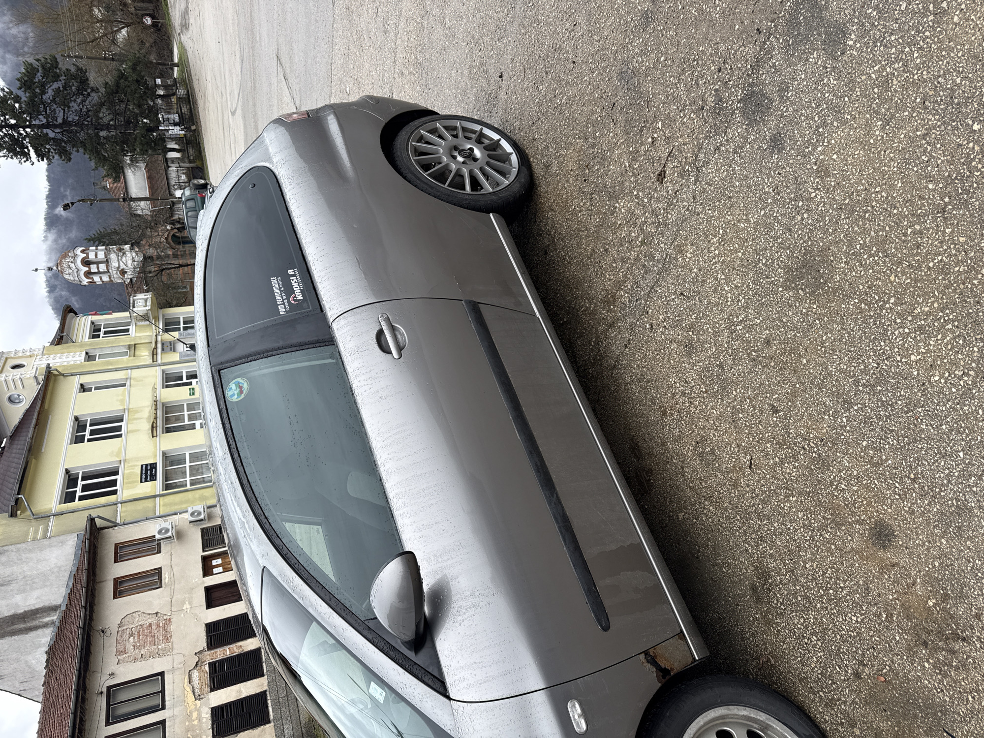 The image depicts a grey car parked on a wet asphalt road in what appears to be a city environment. Behind the car is a row of buildings of varying architectural styles. One building is a light yellow color, while others are older and show signs of wear. The dome of what seems to be a church is visible in the background. The image is taken on an overcast day, likely in Mikre, Bulgaria.