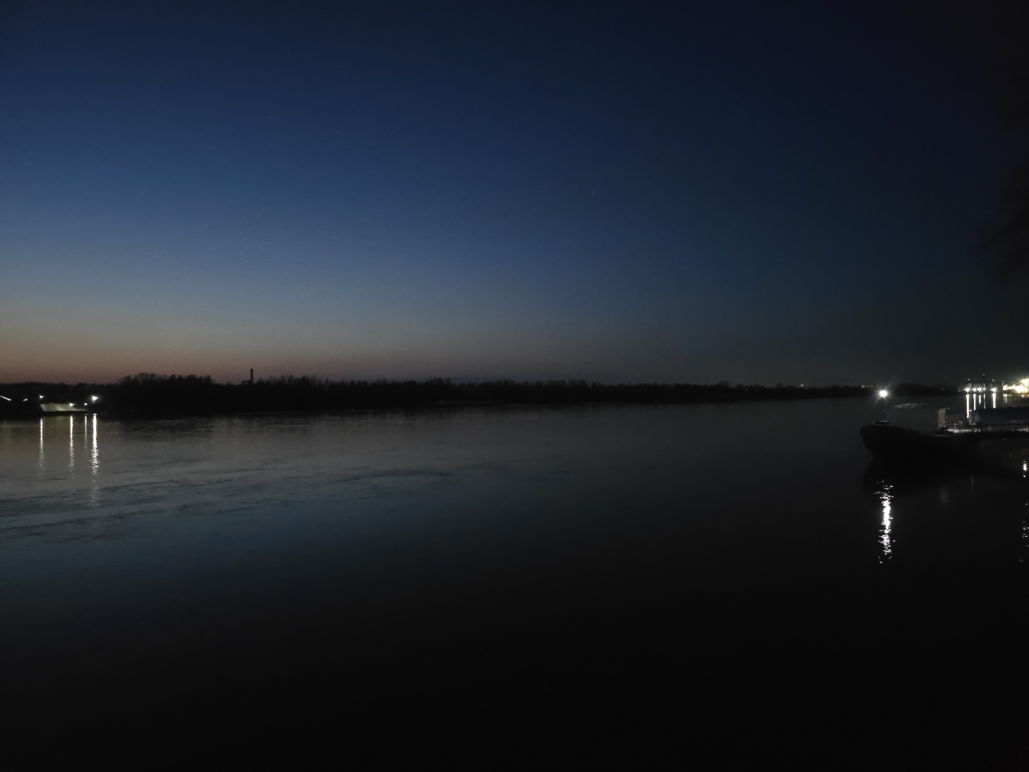 The image depicts a dark, wide body of water, likely the Danube River, at night in Ruse, Bulgaria. The sky transitions from a deep blue at the top to a lighter hue near the horizon. The far bank of the river is visible as a dark silhouette of trees and potentially some buildings. There are artificial lights present on both banks of the river, creating reflections on the water's surface. On the right side of the frame, a boat or barge is moored along the riverbank, illuminated by lights. The foreground is mostly dark, representing the near bank of the river. No people are directly visible. The overall environment is dark, suggestive of either dusk or night.