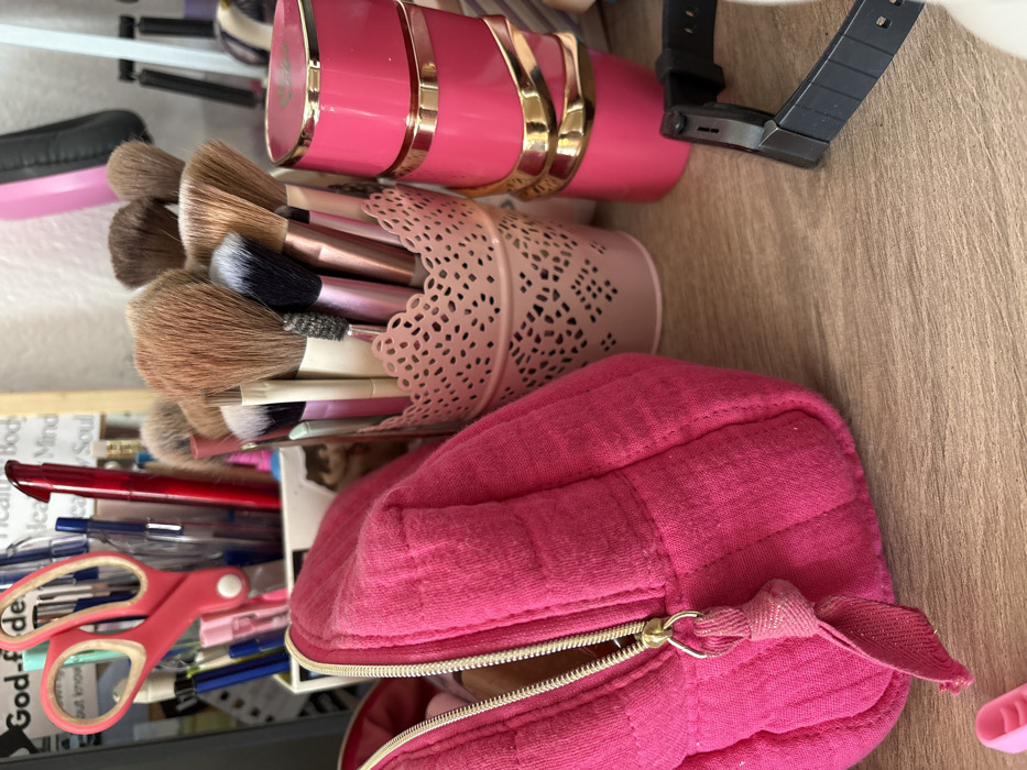 This image depicts a detailed close-up of a cluttered wooden surface, likely a desk or vanity, within an indoor setting in Krivina, Bulgaria. In the immediate foreground, a bright fuchsia-pink quilted fabric pouch with a gold zipper and a knotted fabric pull rests on the left. To its right, in the mid-ground, a light pink metal container with a decorative cut-out lace pattern around its rim holds an assortment of makeup brushes with various bristle colors (brown, black, white) and handle designs. Directly to the right of this container, two stacked cylindrical objects, also bright fuchsia-pink, each feature a distinctive gold-colored wavy band wrapped around their midsections. In the lower right foreground, a black digital wristwatch with a black strap lies horizontally on the wooden surface. Further in the background, behind the pink pouch, a white rectangular holder is filled with stationery items, including a prominent pair of bright pink scissors with white finger loops, multiple pens (red, blue, black, pink), and pencils. Partially visible behind this holder is a light-colored board or poster with text, including "God-F..." on the upper left and "Health Body Mind Soul" centrally. The wooden surface displays a visible grain pattern. No individuals are present in the scene, and all objects are stationary.