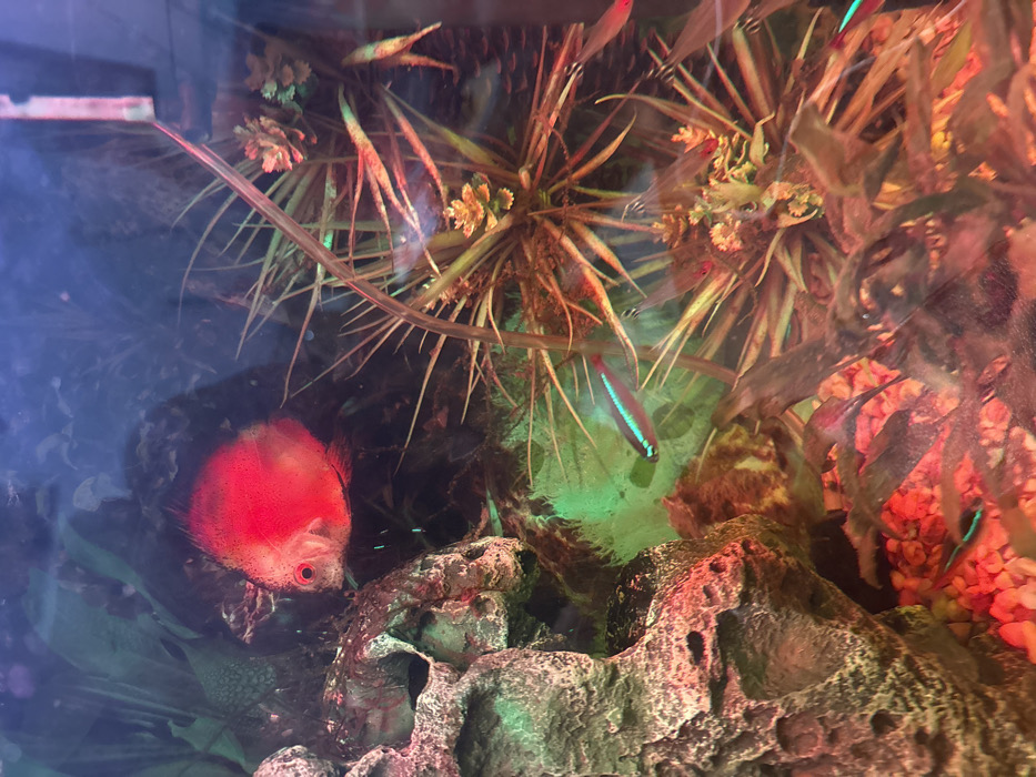 An aquarium scene featuring a red discus fish partially obscured by rocks and plants. Several cardinal tetras swim amidst artificial vegetation. The water appears slightly cloudy, and the decor includes gravel substrate and varied artificial plants with red and green hues. The lighting casts reflections, enhancing the vibrant colors of the fish and decorations.