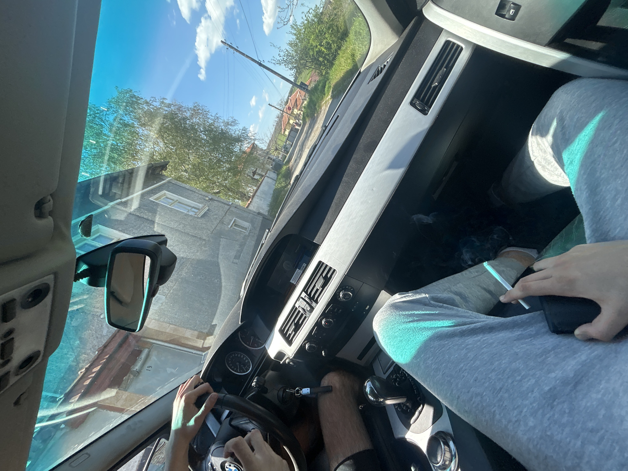 The image depicts the interior of a car, likely in motion, viewed from an elevated, angled perspective. The driver, wearing light gray sweatpants, is visible with hands on the steering wheel. A cigarette is in the driver's other hand. Outside the car, houses, trees, and a street are visible, suggesting an urban or suburban environment. The location is plausibly Loznitsa, Bulgaria, based on architectural styles and landscape.