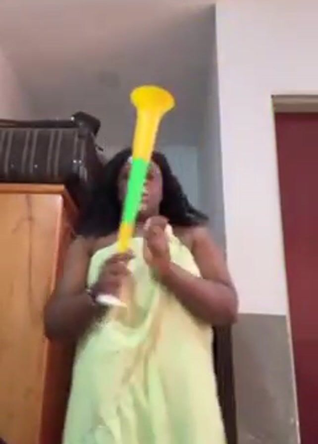A dark-skinned woman with curly, dark hair is standing in what appears to be an indoor area, possibly a room. She has white powder on her face and is wearing a light green cloth wrapped around her body. She holds a large, colorful horn - yellow on top, green in the middle, and white at the bottom - in her right hand. She is moving the horn and her body rhythmically, as if dancing. Behind her, there is a wooden wardrobe with a suitcase on top, and a partially visible red door. The ceiling is white.