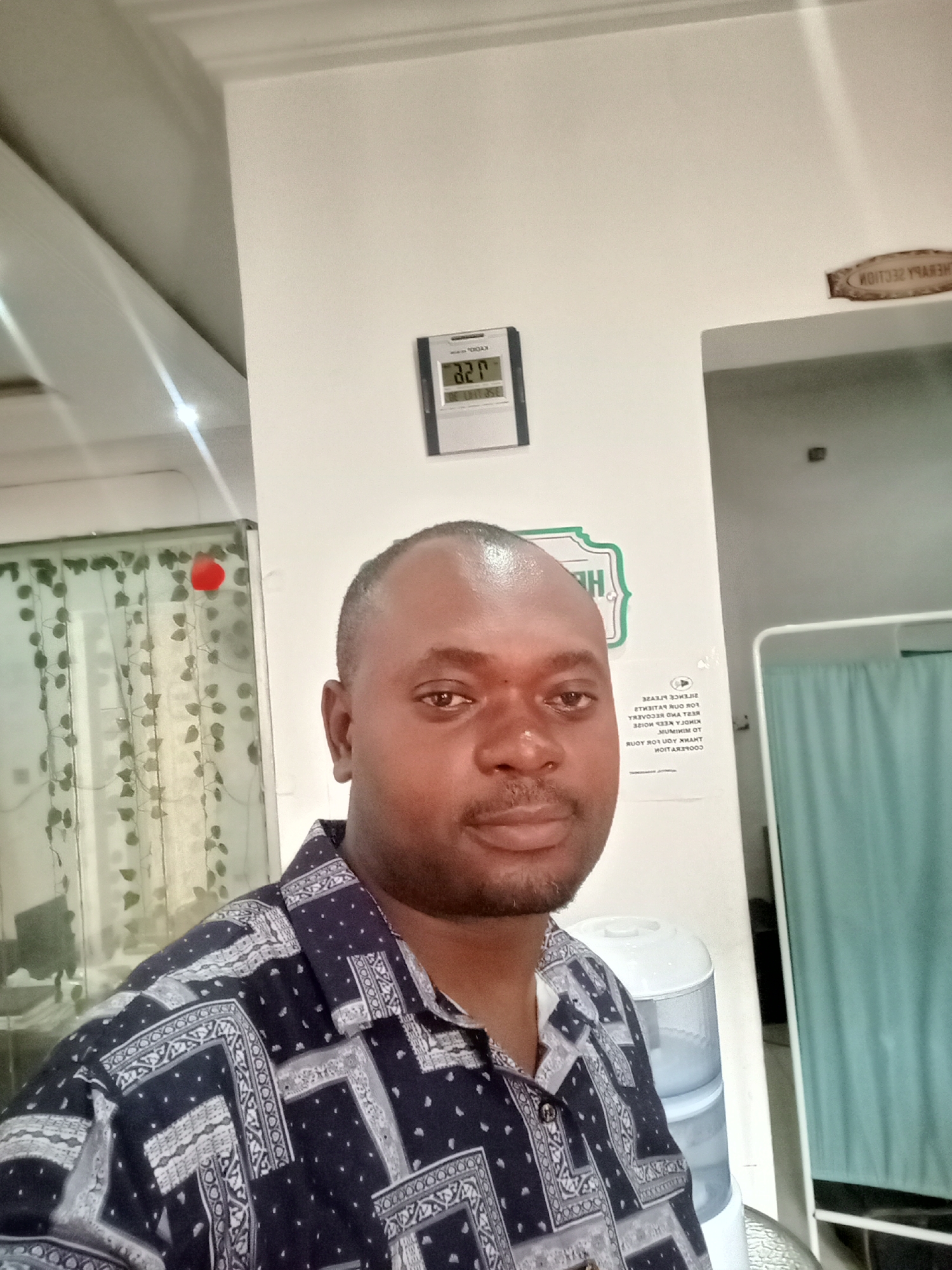 An adult male is centrally positioned within an indoor setting, identified as being in Gwarinpa, Nigeria. The individual has a dark complexion, short dark hair, and a trimmed beard, wearing a dark blue short-sleeved button-up shirt with white and grey geometric patterns. He faces the camera directly with a neutral expression. The background consists of plain white walls and a white ceiling. Mounted on the upper-middle wall is a digital thermometer/clock, possibly Kyorax branded, displaying "22". Above and to its right, a wooden plaque-like sign with mirrored text "NOITCES YPAREHT" (reading "THERAPY SECTION" when reversed) is affixed. To the right of the man's head, a partial green and white sign is visible, bearing mirrored text that includes phrases such as "SILENCE PLEASE," "FOR OUR PATIENTS," "KEEP YOUR VOICE TO A MINIMUM," and "THANK YOU FOR YOUR COOPERATION." In the lower right background, partially obscured by the man's shoulder, stands a white and light blue bottled water dispenser. Further to the right, a light blue medical privacy curtain hangs within a frame. In the upper left background, a glass partition or window is adorned with artificial green leafy vines, featuring a small red decorative element. The environment appears to be a well-lit clinical or office space, illuminated by artificial lighting.