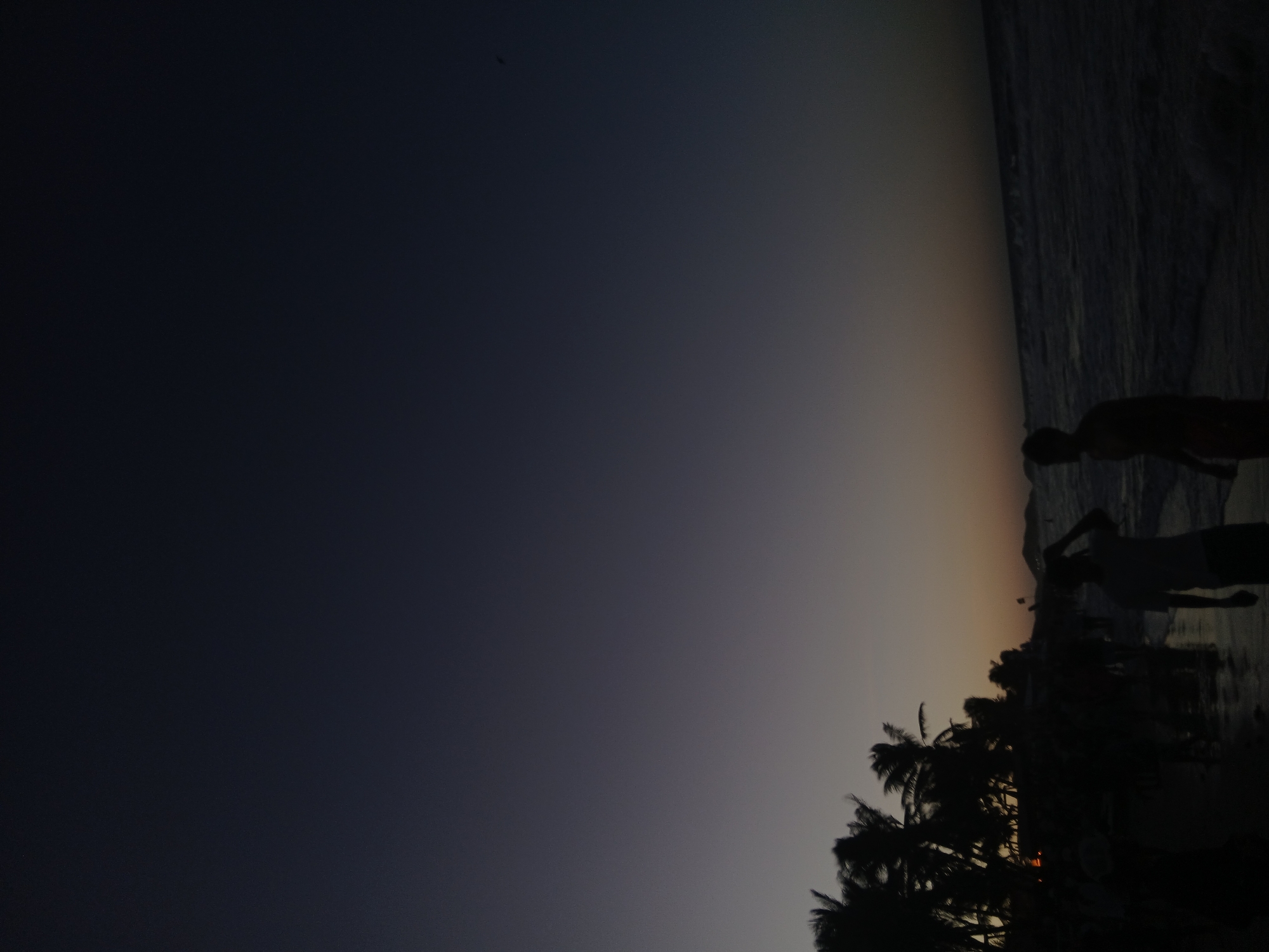 The image captures a coastal scene in Playa Parguito, Venezuela, at twilight. Silhouetted palm trees and a crowd of people stand on the beach. Two figures are distinguishable closer to the water's edge. The sky transitions from a dark blue to a lighter gradient as the sun sets over the ocean.