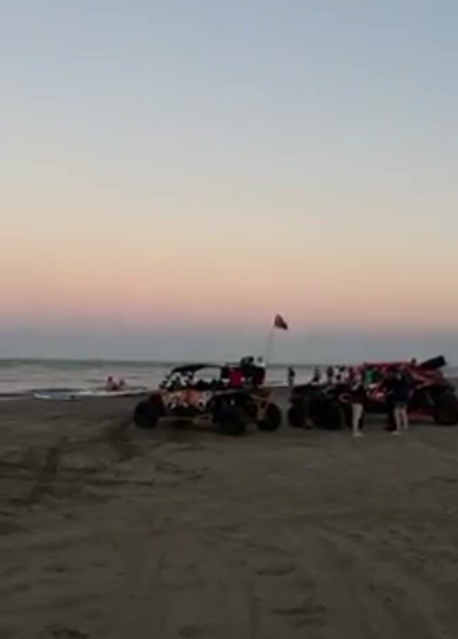 n outdoor scene on a beach, possibly at sunset or dusk given the soft lighting. In the foreground, sandy ground reveals tire tracks, suggesting vehicular activity. Three off-road vehicles, likely UTVs or ATVs, are parked near the shoreline. One has an orange and black design with a flag attached. A group of people is gathered around the vehicles, possibly interacting or preparing to leave. In the distance, some individuals are in the water, perhaps swimming or engaging in water sports. The ocean is visible in the background, meeting the horizon under a pastel-colored sky. Moving towards the right, the video shows vegetation growing on the dunes behind the beach. Silhouetted palm trees and other trees dot the landscape against the fading light. Overall, the scene is one of leisure, relaxation, and outdoor activities at the beach.