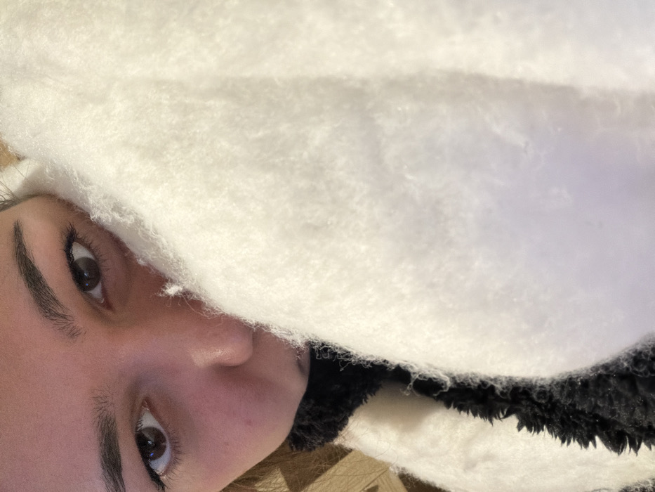 A close-up, rotated view features a person's face partially obscured by a fluffy, white material. The person has brown eyes, dark eyebrows, and a fair complexion. A section of black, furry fabric is visible around the white fluff, suggesting a garment. The overall image has a soft, somewhat hazy quality.