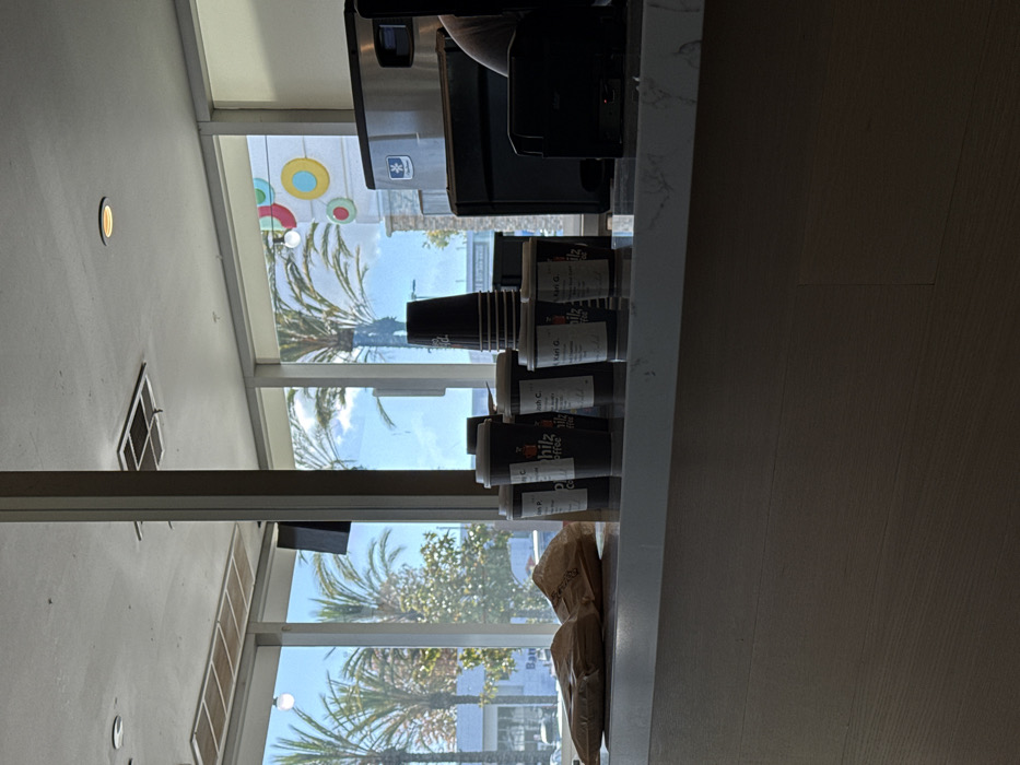 The image displays a counter near a window with a view of palm trees. A coffee machine is positioned on the counter, next to stacked cups with "Philz Coffee" branding. Below the cups are brown paper bags, presumably containing pastries or food items. The outdoor scenery is visible through the window, depicting palm trees and a clear blue sky.