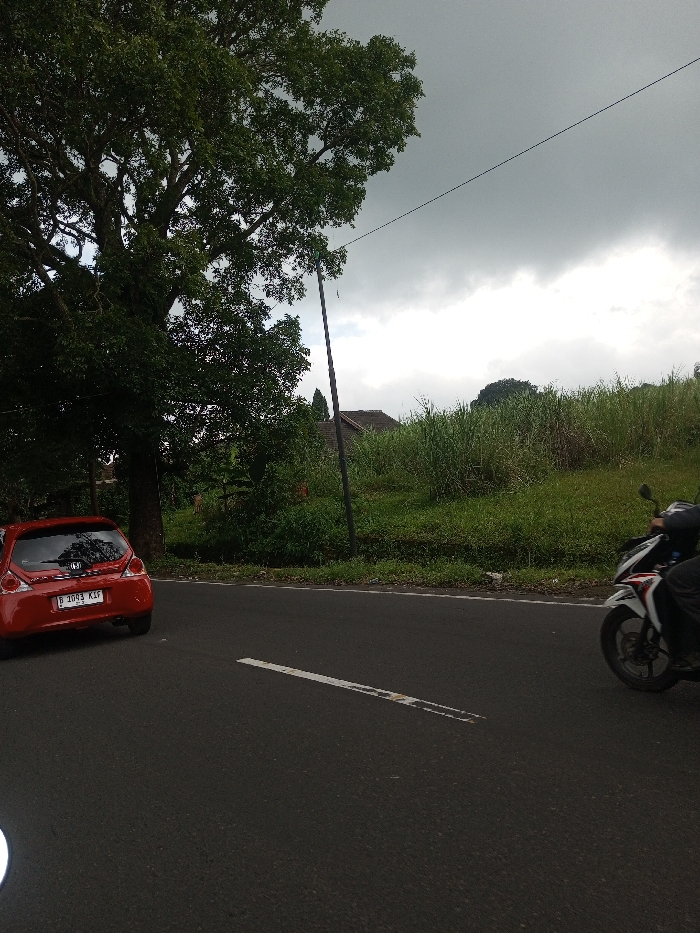 The scene depicts a roadside in Ciherang, Indonesia, under an overcast sky. A dark asphalt road with a faded white dashed line in the center extends from the foreground into the midground. On the left side of the road, a red Honda Brio hatchback, bearing license plate B 1093 KIF, is stationary or parked, facing away from the camera. Adjacent to the parked car on the left is a large tree with dense green foliage. To the right of the tree, a dark utility pole stands upright, supporting a single overhead wire that spans horizontally across the upper midground. Behind the utility pole and the tree is an elevated embankment covered in tall, green grasses and vegetation. A building with a brown roof is partially visible on this embankment. On the right side of the road, a person on a white and black motorcycle is partially visible, moving from right to left across the frame, with the rider's legs and lower torso visible. The image perspective suggests it was taken from another vehicle or motorcycle.