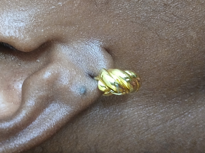 A close-up image details the right ear of an individual with dark skin, positioned within a hospital ward in Kenya. A single, gold-colored, twisted hoop earring is present in the pierced earlobe. The skin exhibits a consistent dark tone with diffuse reflections, suggesting direct illumination. A small, dark, raised lesion is visible on the earlobe, superior and posterior to the earring. The immediate surrounding area and background are out of focus, depicting indistinct skin or a plain, light-colored fabric.
