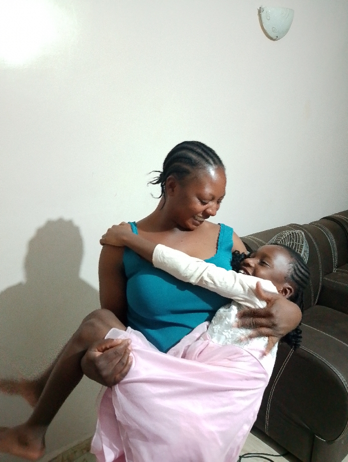 A woman wearing a teal tank top and braided hair holds a young girl in her arms. The girl, also with braided hair, wears a long-sleeved white shirt and a pale pink skirt. Both are smiling and appear to be enjoying the moment. A wall with a light fixture is visible in the background, along with the arm of a brown leather sofa. The woman's shadow is cast on the wall.