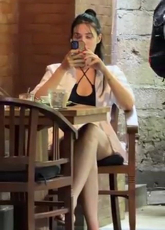 A young woman is seated at a wooden table in what appears to be an outdoor dining area with brick and stone walls. She is wearing a black top with thin straps crisscrossing in the front, a light-colored blazer, and a short skirt or shorts. Her hair is pulled back into a bun. The woman is looking down at her phone, holding it with both hands as if she is texting or browsing. On the table, there's a half-empty glass of water, a salad, and other items partially obscured. She is sitting with her legs crossed. A wooden chair and a portion of a motorcycle are visible in the background. The lighting is subdued, suggesting it's either evening or an interior space with limited natural light.