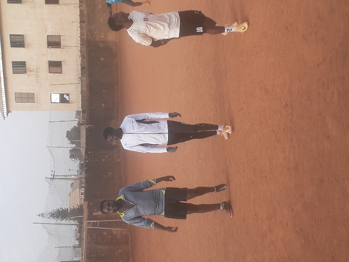 Three men are seen standing on what appears to be a tennis court. The man at the top is wearing a white shirt and dark shorts, the man in the middle is wearing a white jacket and dark pants, and the man at the bottom is wearing a gray shirt and dark shorts. All three men are wearing sneakers. A net can be seen in the background, and a building is visible in the upper left corner. The ground is reddish-brown, suggesting a clay surface.