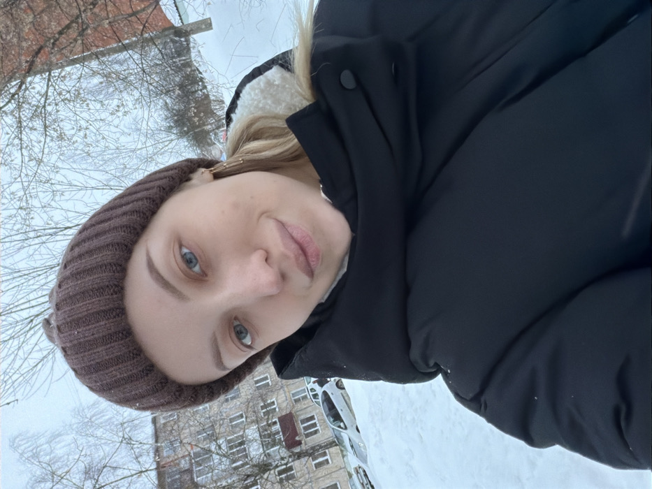 A fair-skinned woman is depicted in a close-up selfie, facing the camera directly with a subtle smile. She has blonde hair, blue eyes, and light brown eyebrows, wearing a dark brown ribbed knit beanie and a black puffer jacket with a visible white sherpa-lined collar. A golden-colored dangle earring is present on her right ear. The scene is outdoors in winter, characterized by widespread snow coverage on the ground. In the background, a multi-story apartment building with numerous windows is visible, constructed of light-colored material, likely brick. Several light-colored cars are parked along a snow-covered area in front of the building. Bare deciduous trees stand against an overcast sky. This scene is located in a residential area of Reshetnikovo, Russia.