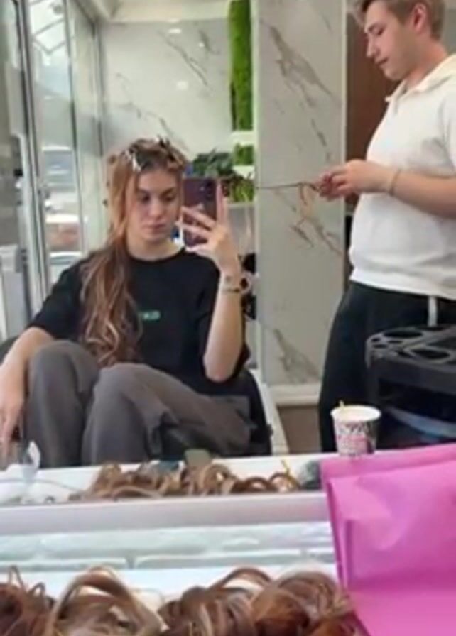 In a well-lit salon, a young woman with auburn hair sits in a salon chair, taking a selfie with her phone. She's wearing a black t-shirt and grey sweatpants, and her hair is partially clipped up. A male hairstylist, in a white polo and black pants, stands behind her, preparing a strand of auburn hair for extension. A mirror shows a table cluttered with hair extensions, hair products, and a pink sheet. The salon has marble-effect walls, large windows, and some green wall decor. The background music has a Latin beat.