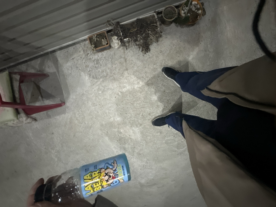 The scene depicts a first-person, downward-facing perspective in General Toshevo, Bulgaria, on a grey, possibly concrete, surface. A person is visible from the waist down, wearing dark blue track pants with beige side stripes and dark sneakers with white soles. A beige overcoat or jacket is partially visible on the left. The person's right hand holds a clear plastic bottle with a black cap and light blue liquid. The bottle's label features "LAVA BEAR" and "P_SEVEN LIMITED EDITION" with a cartoon bear graphic. To the upper right, a red plastic chair with a light cushion is present. Along the right edge of the frame, against a corrugated metal wall, are several items: a rectangular brown planter with small green plants, a smaller round pot with dried vegetation, a pile of dark dried plant material, and another decorative planter with white stones and green elements. The lighting is dim.
