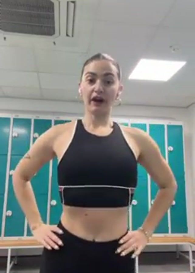A woman stands in front of a row of lockers in a gym locker room. She wears black leggings and a black sports bra. She has gold hoop earrings and her hair is pulled back. She speaks to the camera about starting her day at the gym before work. She places her hands on her hips, then reaches out towards the camera. The lockers are teal. The ceiling is white and has a vent.