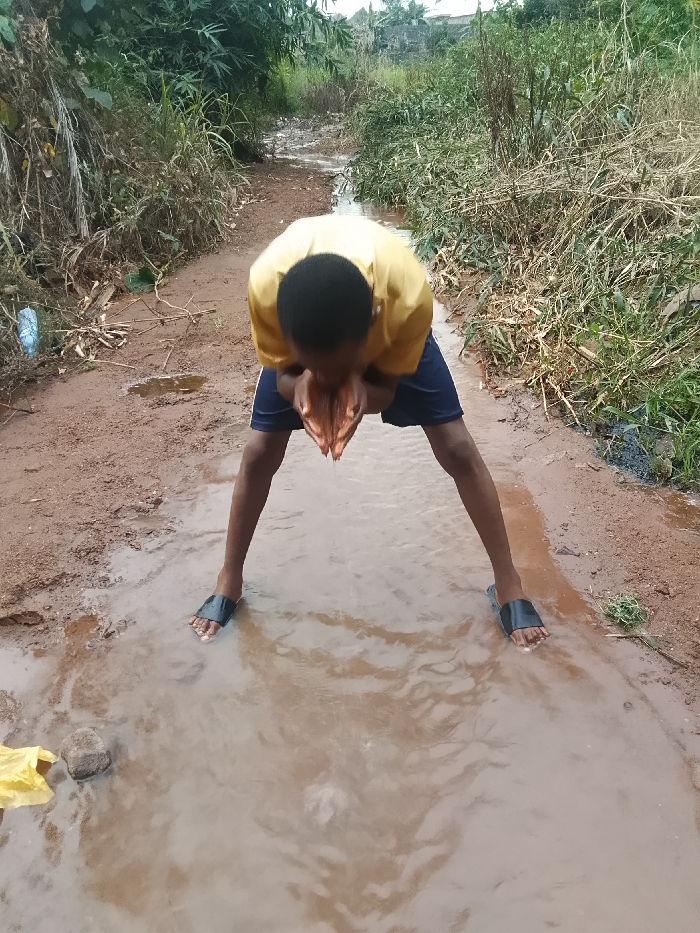 A person in a yellow shirt and blue shorts stands in a muddy stream, leaning forward with hands cupped to their face, possibly drinking or washing. The stream flows through a dirt path flanked by dense green vegetation. The water appears murky and shallow, with visible ripples and reflections. The person wears dark sandals. A plastic bottle is visible on the left bank, and a yellow bag lies near a rock in the water.
