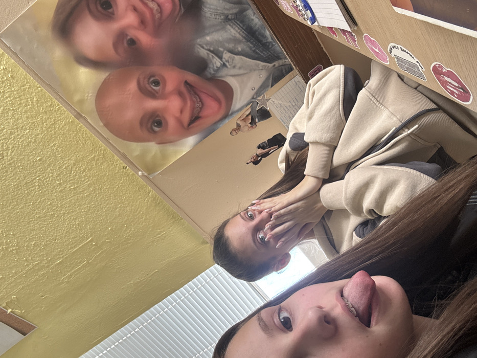 This image captures two young females in an indoor setting in Cherven Bryag, Bulgaria. The shot is an upward-angled close-up, possibly a selfie. In the foreground on the left, a female subject is partially visible, facing the camera. She has long brown hair and is sticking her tongue out, displaying dental braces on her upper teeth. Her expression is informal and playful. In the mid-ground, to the right of the first subject, a second female subject is seated. She has long brown hair and is wearing a light beige hooded sweatshirt with dark accents. Her hands are covering her mouth, with fingers slightly spread, revealing a playful or surprised expression in her wide-open eyes. Her nails are long and appear manicured. The background elements include a light brown wall adorned with several items. Dominating the upper right is a large poster featuring two distorted faces, seemingly from a photographic filter, one bald with wide eyes and a protruding tongue, and another partially visible face. Below this, two smaller images are affixed: one of a person in a dark top, and another of a shirtless male figure with a star. A handwritten paper is also visible on the wall. The upper left of the image shows a window with horizontal white blinds and a textured, golden-colored ceiling. In the lower right foreground, a light-colored wooden desk surface is visible, covered with various stickers including a pink kiss mark, a brain graphic, and a record player needle. A spiral-bound notebook or planner and a blue writing implement are also present on the desk.