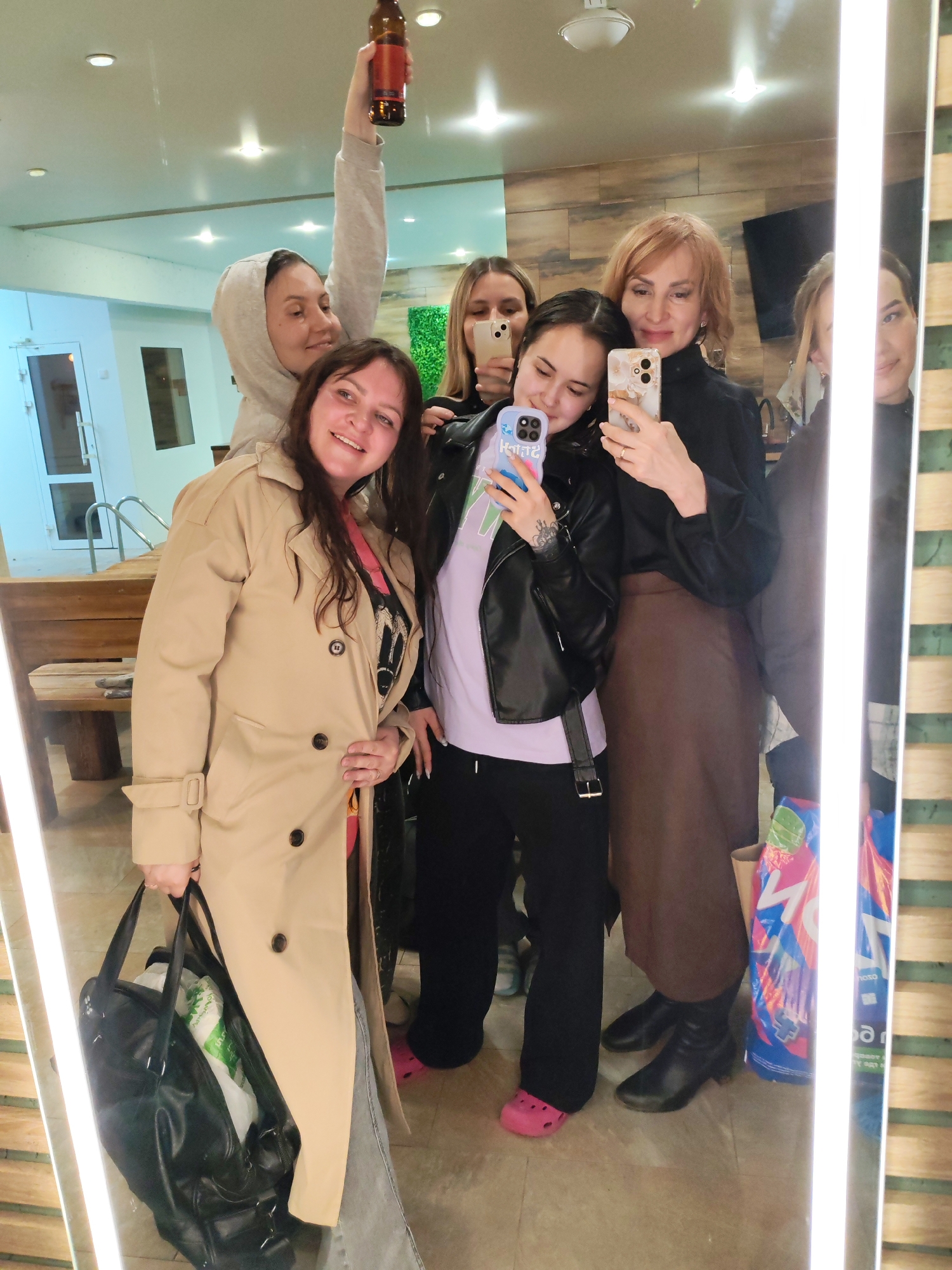 A group of six women are posing for a selfie in front of a mirror. The woman on the left is wearing a tan trench coat and holding a large black purse. Behind her, a woman in a grey hoodie holds a bottle aloft. In the center, a woman in a black leather jacket takes a selfie with a phone. To her right, a woman in a black turtleneck and brown skirt is taking the selfie reflected in the mirror. The location appears to be inside a building in Chaikovsky, Russia, based on available information. A glimpse of a pool area can be seen through a doorway in the background.