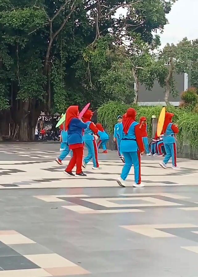 A group of about 8 people are standing in a line outside on a paved plaza. They are wearing matching outfits that are primarily blue and red. Some of the group are holding colored umbrellas. There is a tree to the left of the frame and a building in the background. The camera angle is from the side, resulting in a vertical video.