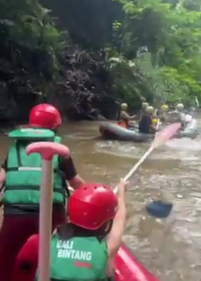 A first-person view shows whitewater rafting on a shallow, brown river surrounded by dense green trees