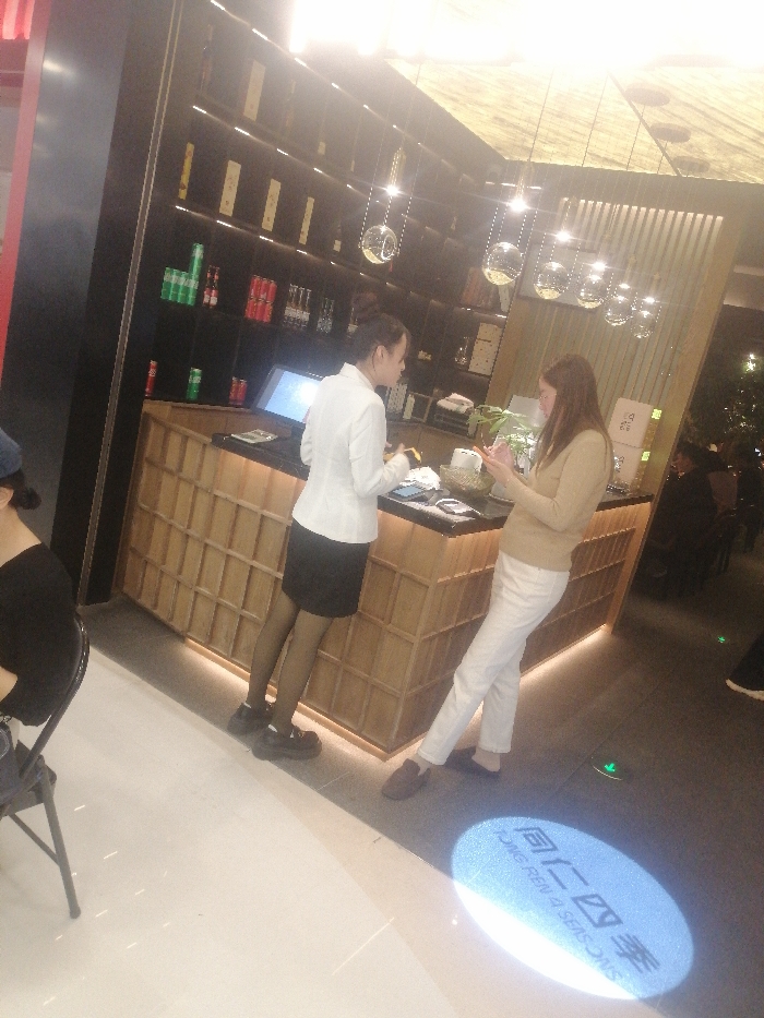 This image depicts the interior of a "Tong Ren 4 Seasons" restaurant located in Dongcheng District, China. Two females are positioned at a central counter. The individual on the left, presumed an employee, stands behind a light-colored, wood-paneled counter with a dark top. She wears a white blazer, black skirt, sheer black stockings, and black flat shoes. Her hair is styled in an updo, and she is looking down at the counter, appearing to interact with items or a system. A computer monitor/POS system is visible on the counter behind her. The individual on the right, presumed a customer, stands in front of the counter, facing partially towards the employee. She wears a light tan long-sleeved top and white pants, with brown loafers visible on her feet. Her long brown hair is down, and she is actively holding and looking at a smartphone. Behind the counter, a dark shelving unit displays various items, including multiple green and red beverage cans (identifiable as Coca-Cola products) and other packaged goods. Spherical pendant lights hang from the ceiling above the counter area. The floor transitions from a light, possibly tiled, surface in the immediate foreground to a darker surface where a blue-white circular logo projection reading "TONG REN 4 SEASONS" in English and Chinese is visible. Green directional arrows are also present on the darker floor. The background is dimly lit and blurred, showing hints of other patrons and seating arrangements.
