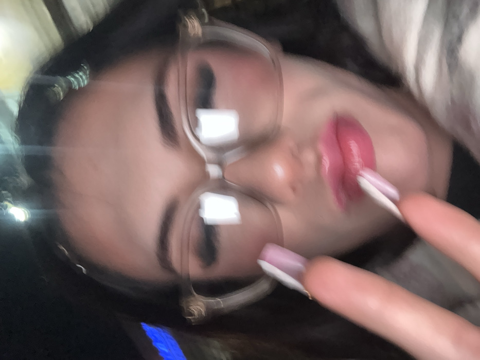 A blurry close-up shows a person with dark hair and light skin. They are wearing clear glasses with a gold accent. The person is wearing makeup, including dark eyeliner and glossy pink lipstick. Two fingers with long nails that have a pink and white design are in the foreground. A glimpse of blue light is visible in the bottom left corner, suggesting an outdoor or urban setting.