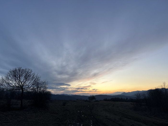 An outdoor landscape photograph, captured at dusk in Tipchenitsa, Bulgaria, depicts a rural area